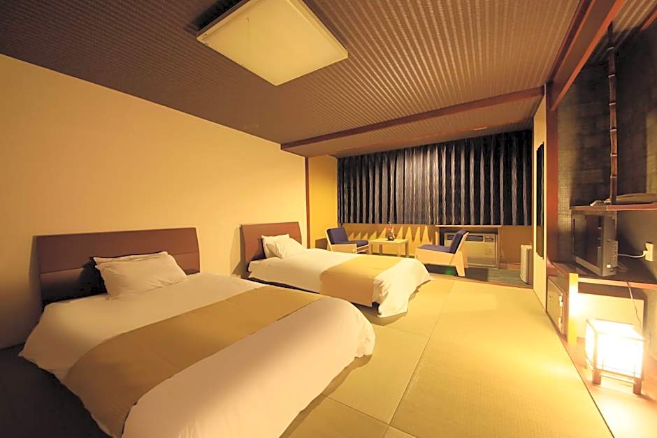 The twin room includes a private bathroom, well-fitted with a bath, a shower, a bidet, a hairdryer and slippers. This twin room is air-conditioned and has a seating area with a flat-screen TV, tatami, a wardrobe, a safe deposit box, as well as an electric kettle. The unit has 2 beds and 1 futon.